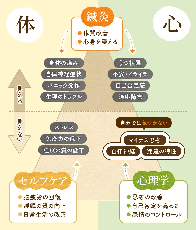 心理学で「感情」、鍼灸で「自律神経」にアプローチするので、薬でも改善しなかった心身不調を根本から回復へ導きます