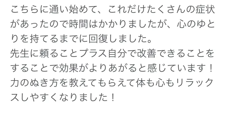 特に心理的ストレスが関わる症状は改善までに時間がかかることもあるため、一律に「何回で良くなる」とは言えません。