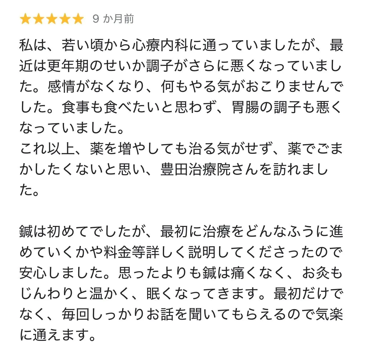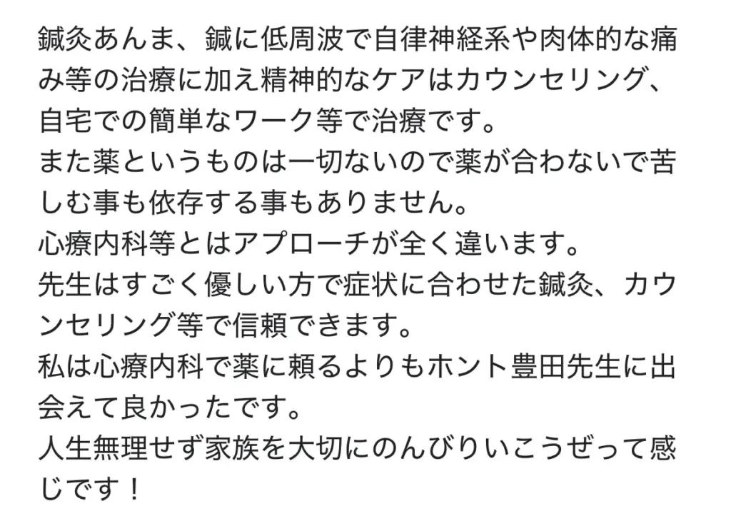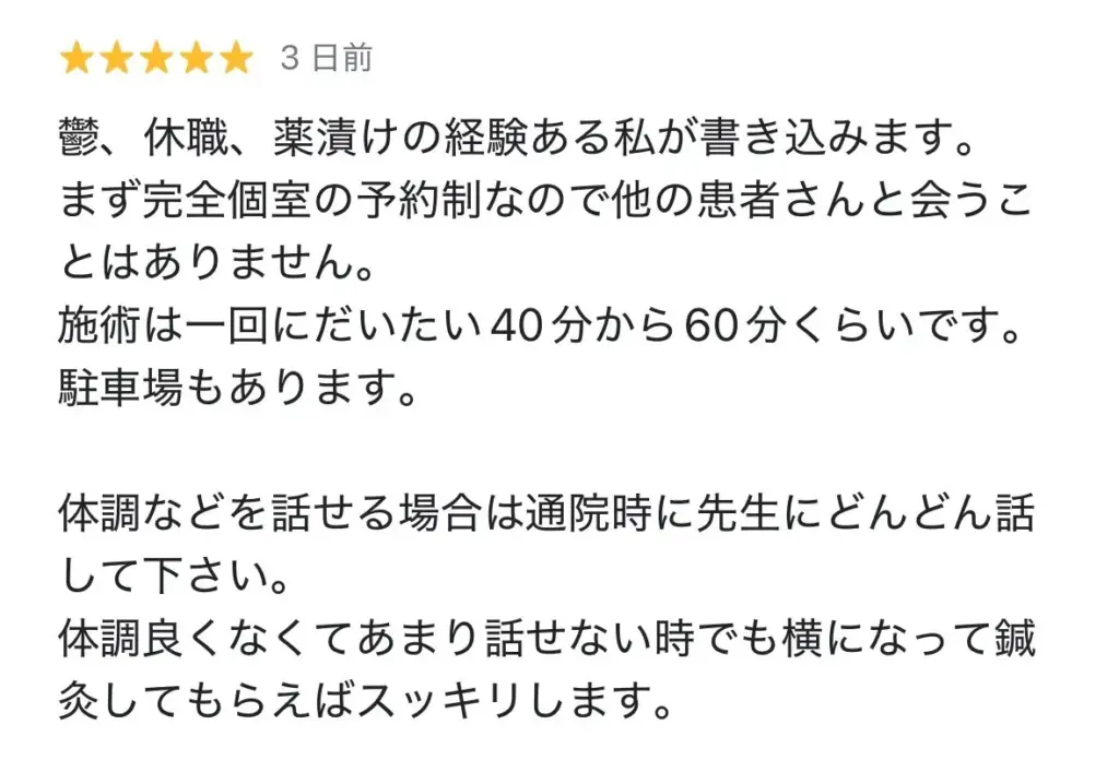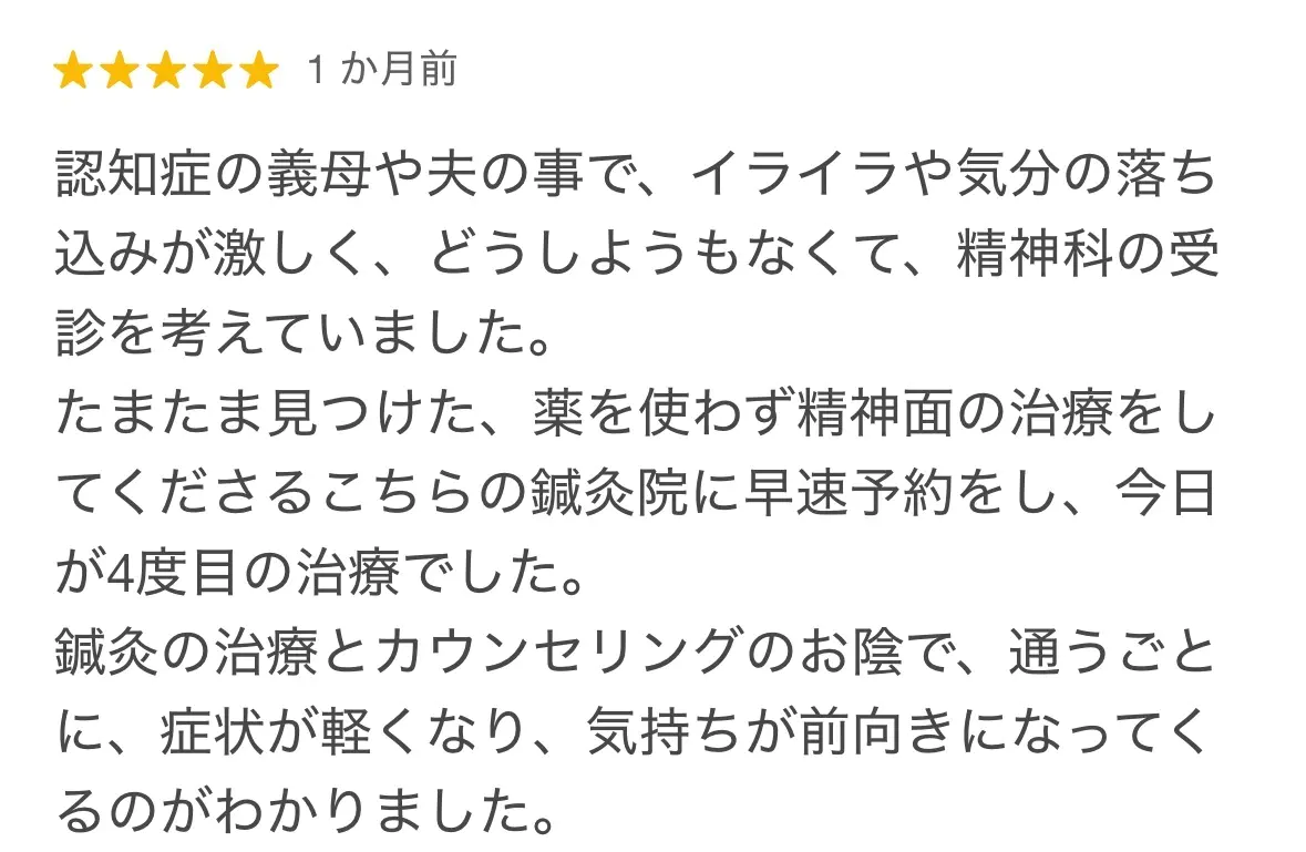 施術中の会話を通して、不安や心配事を伺いながら心のケアを行い、自己否定の考えがある場合には、より楽に過ごせるように考え方を整えています。45分の施術には、鍼灸と心理的なサポートの両方が含まれています。