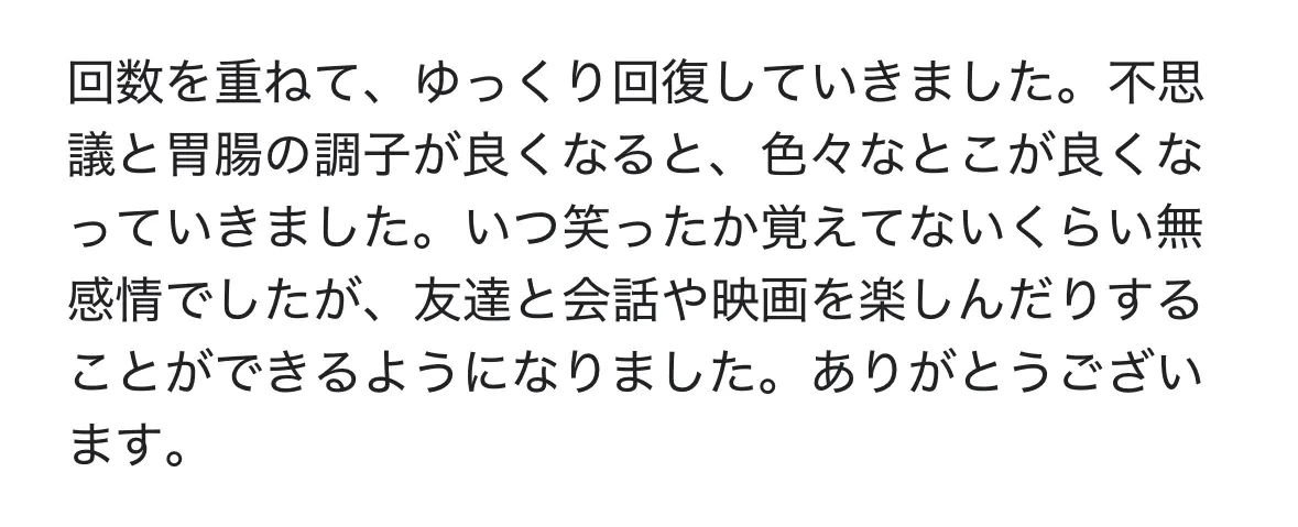 実際には、当初のつらさがなくなったり、社会復帰できた段階で治療を終える方もいれば、月に1〜2回のメンテナンス通院を希望される方もいらっしゃいます。