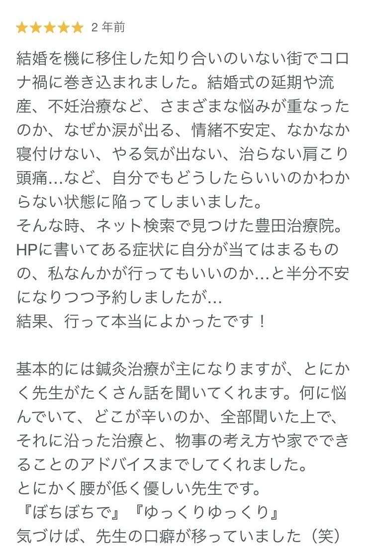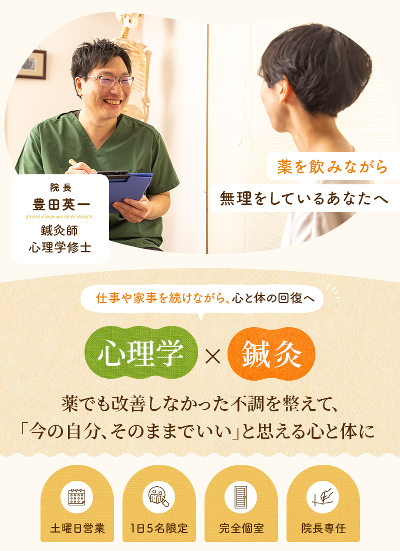 「このままでは全てがダメになる」と焦り、藁をも掴む気持ちで鍼灸を試そうと、ホームページを見て豊田治療院さんに来ました。