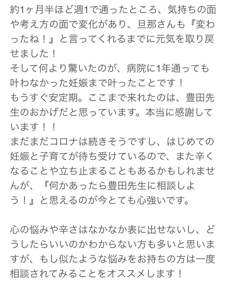 そして、体も重だるさがとれて力が入るようになり、仕事に完全復帰できるようになりました。この数年間、経験したことがないスッキリ感があり、豊田先生には本当に感謝しています。