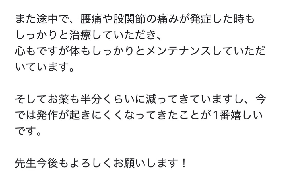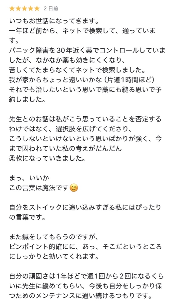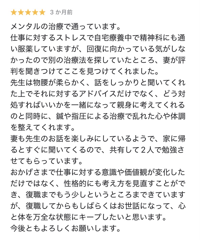 改善までの回数は、症状の程度・発症からの期間・生活への影響によって異なります。とくに心理的なストレスが関わる不調は、改善までに時間がかかる場合もあります。