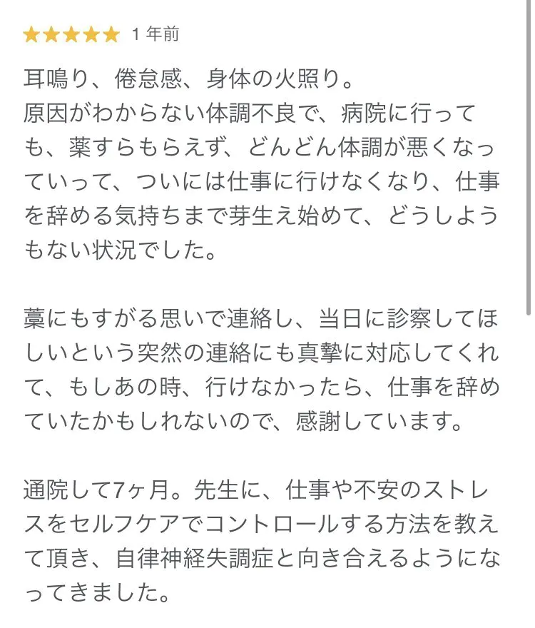 当院では、無意識に抑え込んでいる感情を見出し鍼灸施術を行うので、「薬だけでは改善しにくい心身不調」の回復を目指せます。