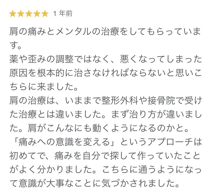 胸の痛みも、以前は会社を休む程の痛みだったのですが、通院を始めて鍼灸をしていくうちに、痛みが消えていき、会社にも安心して行けるようになりました。