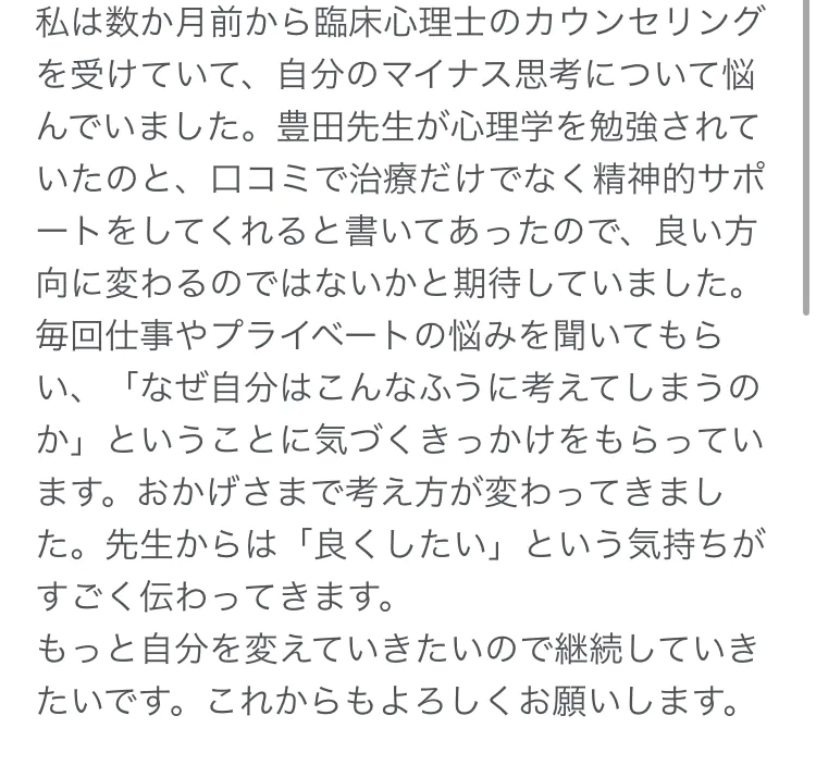 ちょっとした不安なことも、丁寧に聞いて下さり、心が穏やかになります。 先生には本当に感謝しております。ありがとうございます。