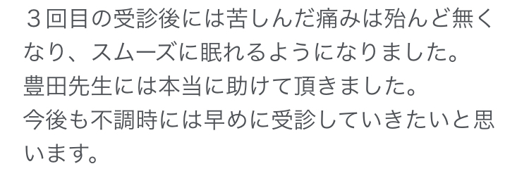 私が勤めている会社の方で、豊田治療院さんのことをご存知の方いて、勧めて頂きました。 通院を始めて、約3ヶ月程経過します。 施術内容は鍼灸とマッサージとカウンセリングを受けていて、いつも丁寧に診て頂いてます。